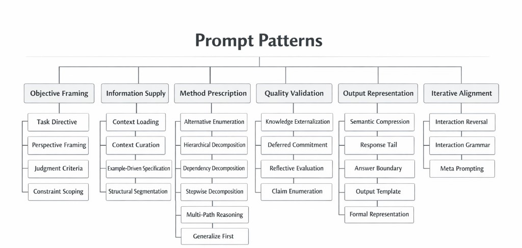 What is a prompt pattern? A prompt pattern is a deliberate design move at the prompt level, not a magic phrase, not a framework, and not a model-specific technique. Patterns help you control objective, context, constraints, method, validation, and output structure. The goal is reliability and shared vocabulary, not prompt "tricks" or superficial tuning. Patterns are explainable, composable, and stable enough to use across tasks, teams, and model changes.
