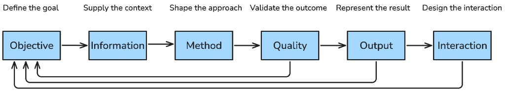 Prompting principles are the core design principles of effective prompting. They define how to specify intent, provide context, guide the model, validate results, shape outputs, and refine interactions over time.
